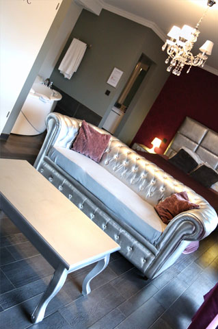 La suite est composée d'un grand lit, un coin salon avec tv led 46’’, dvd , tour i-pod et wifi. Pour vous relaxer vous aurez à disposition une baignoire à jets hydromassants deux personnes avec chromothérapie.